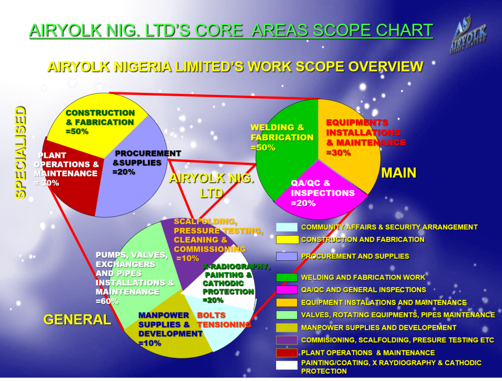 AIRYOLK NIGERIA LIMITED is a world class Oil and Gas Services, Support and Engineering Company that was incorporated in the year 2001 and has since progressed into most areas of the Oil and Gas services sector, including offshore, onshore and deep-water operations.