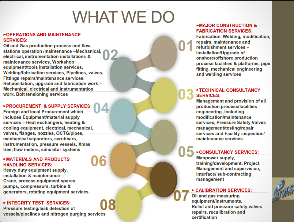 Oil and Gas production process and flow stations operation /maintenance –Mechanical, electrical, instrumentation installations & maintenance services, Workshop equipment/tools installation services, Welding/fabrication services, Pipelines, valves, Fittings repairs/maintenance services.